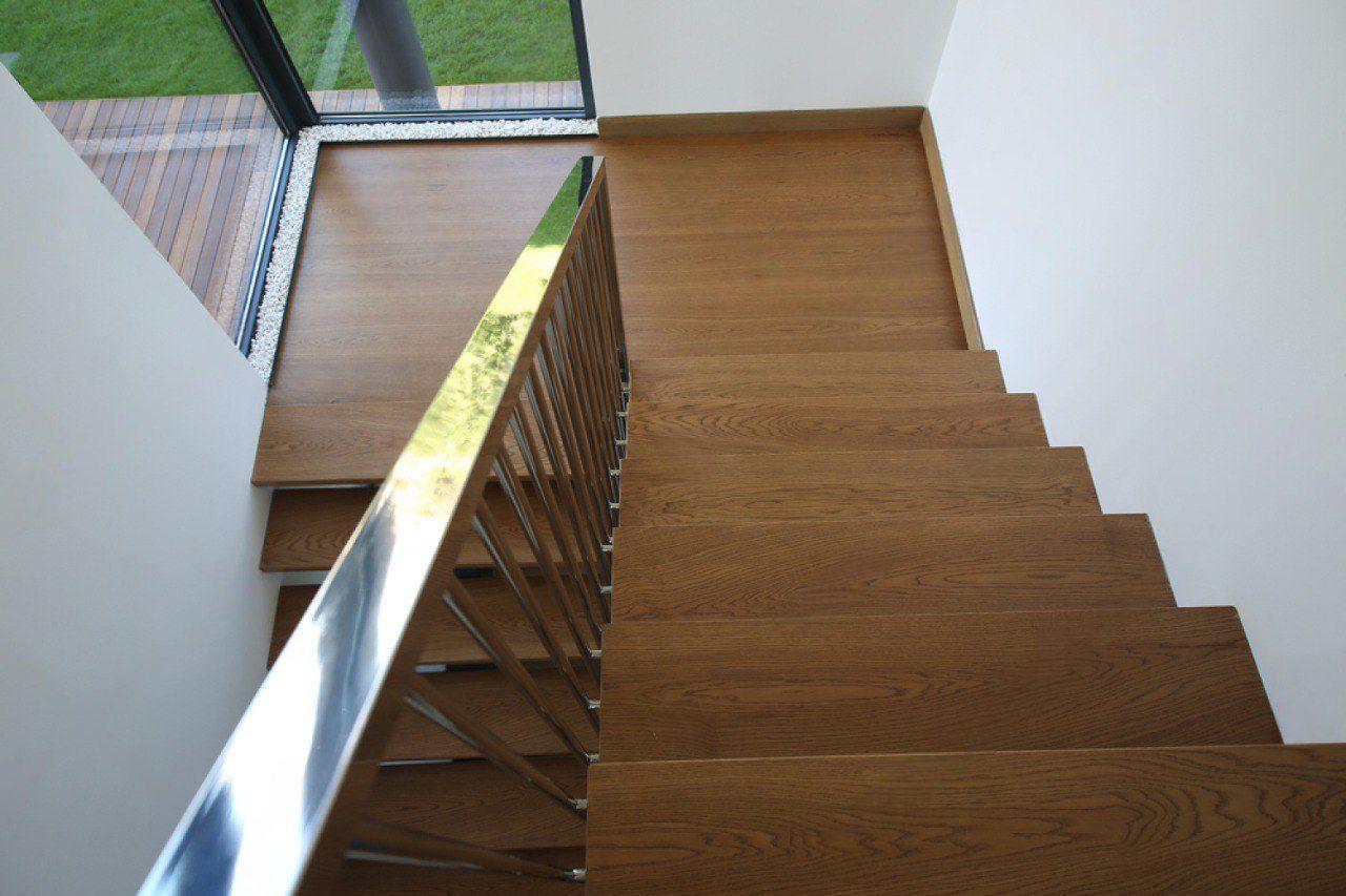 Основой проекта стали ступени из благородного дуба, которые мы установили на бетонный каркас. Ключевой дизайнерский ход — подступенки оштукатурены и окрашены в тот же светлый тон, что и прилегающая стена. За счет этого они сливаются с пространством, создавая тот самый эффект «парящих» ступеней. Завершает образ легкое и графичное ограждение из хромированных металлических прутьев, которое гармонично поддерживает общий стиль дома.
