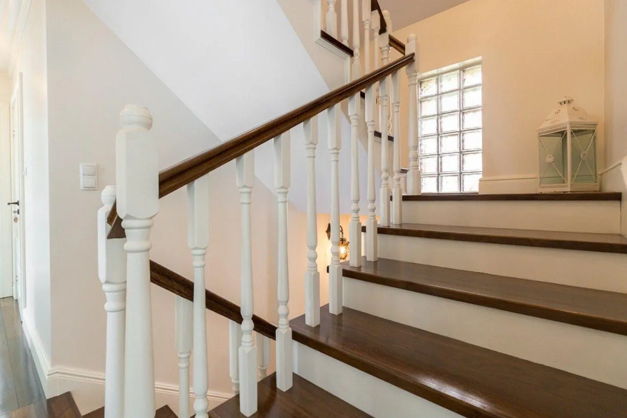 Идея для вашей лестницы: Если вы хотите добавить интерьеру динамики, рассмотрите контрастное решение: темные ступени (например, из тонированного дуба или бука) в сочетании со светлыми, практически белыми подступенками и ограждением. Это создаст эффектный графичный рисунок.
