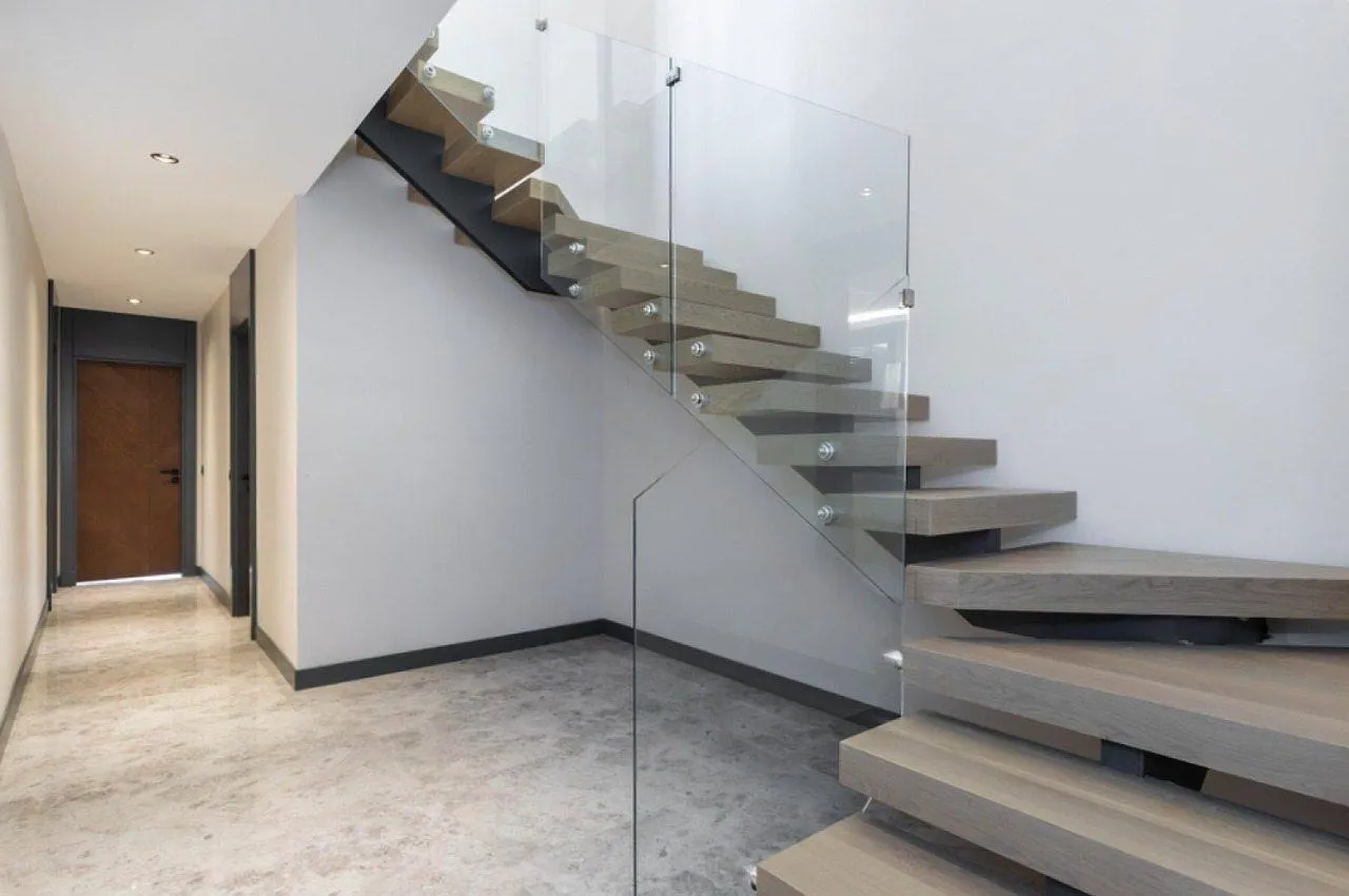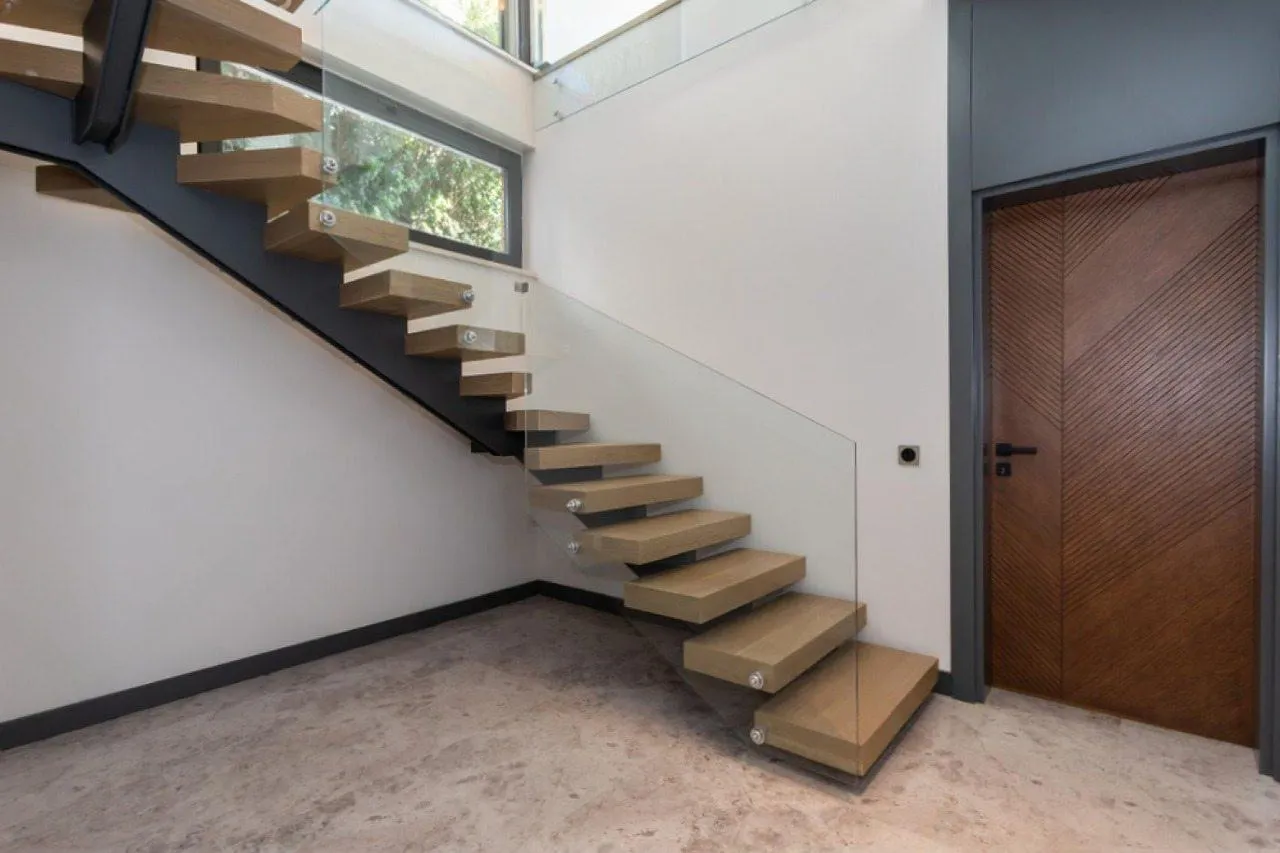 Визуальная легкость. За счет центральной балки и отсутствия подступенков конструкция выглядит «воздушной», не утяжеляет интерьер и пропускает максимум естественного света.